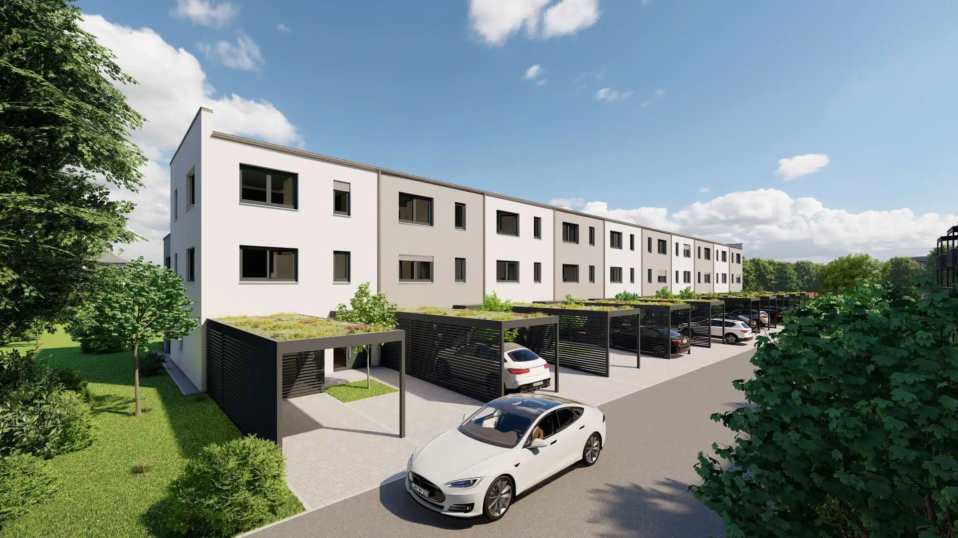 - Tiefgarage bei den Mehrfamilienhäusern, Carports bei den Reihenhäusern